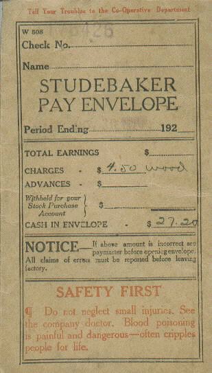 He received $27.20 after a $4.50 deduction was made for "wood." That notation refers to scrap wood which was delivered to workers' homes where it could be burned in place of more expensive coal. The "wood wagons" were discontinued before my time, but I do recall my grandfather shoveling coal into the furnace located in the basement of his house at 313 Johnson Street in South Bend. The pay
